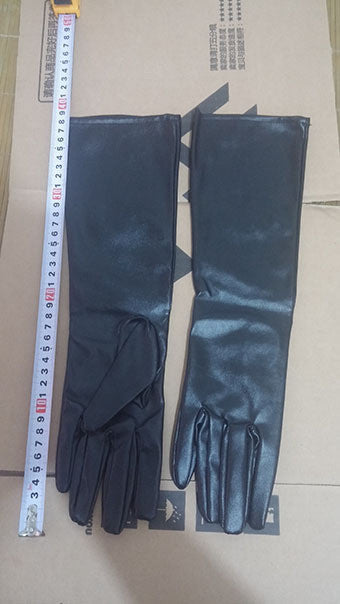Synthetic leather gloves and mittens which is long up to the elbow level. This is a fashionable item suitable for outdoor use during cold weather conditions.