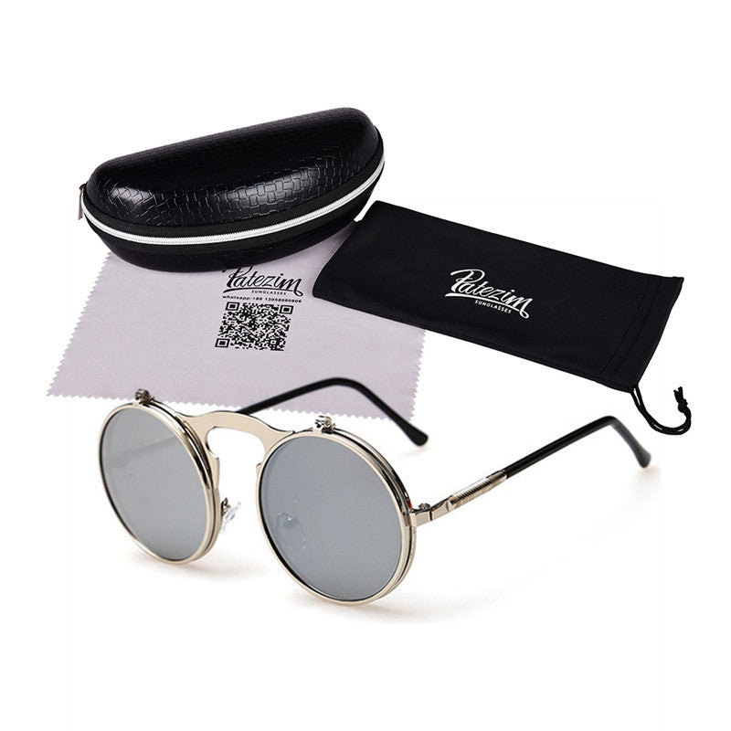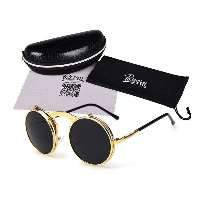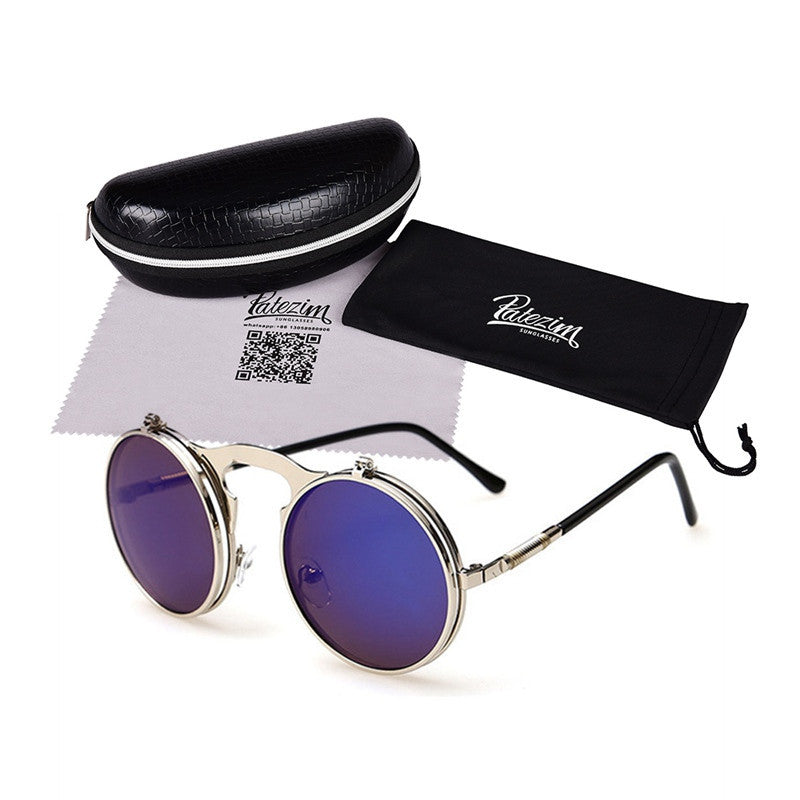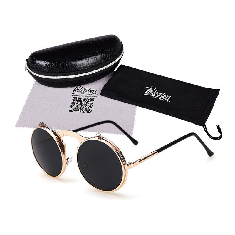 Designer steampunk unisex metal sunglasses with a round frame and vintage design. This is a trendy sunglasses for both genders.