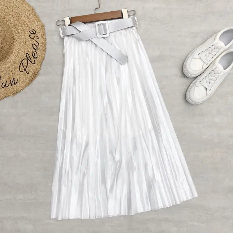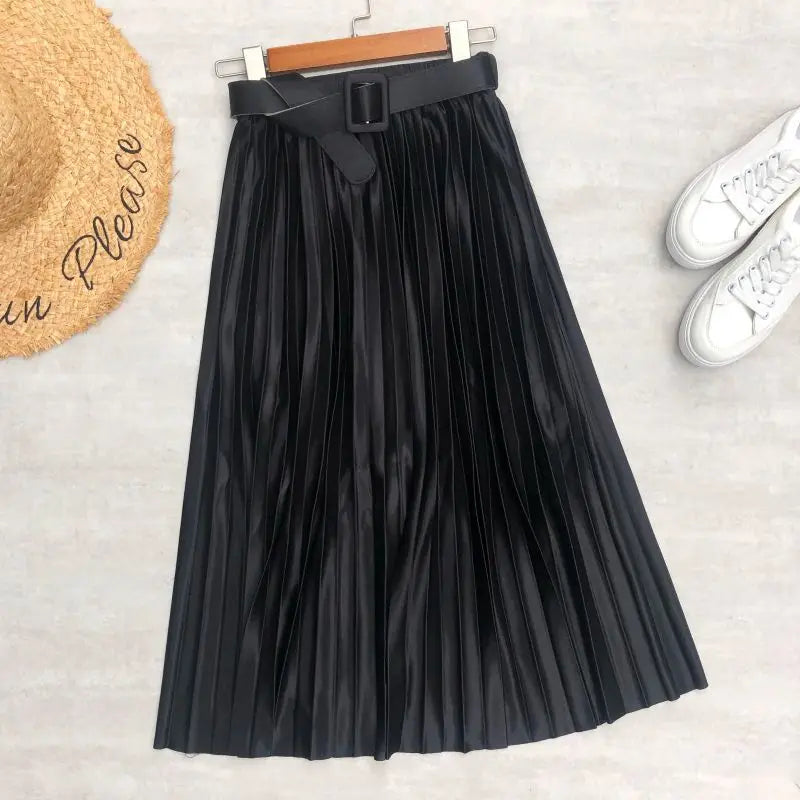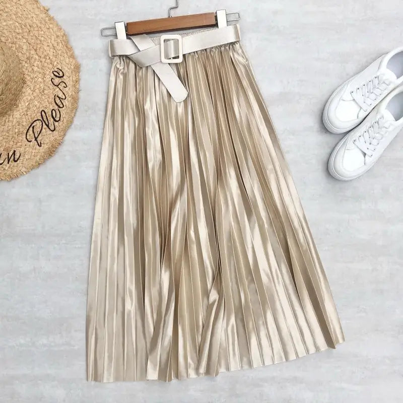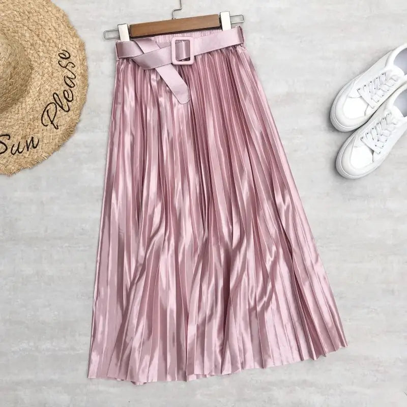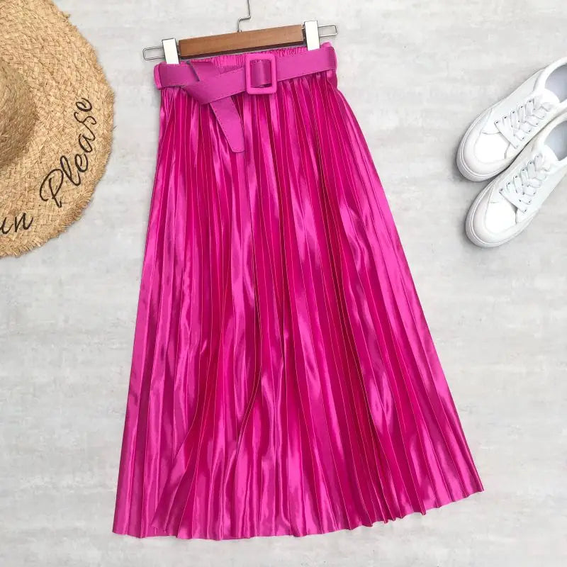 Introducing our High Waist Elegant Stain Women's Pleated Skirts with Belted Solid Skirts Mi-long Umbrella Skirt Spring Summer, designed for the fashion-forward woman who values both style and comfort. This exquisite skirt features a high waist that accentuates your silhouette while providing a flattering fit for all body types. The elegant satin fabric drapes beautifully, making it an ideal choice for both casual outings and more formal occasions.