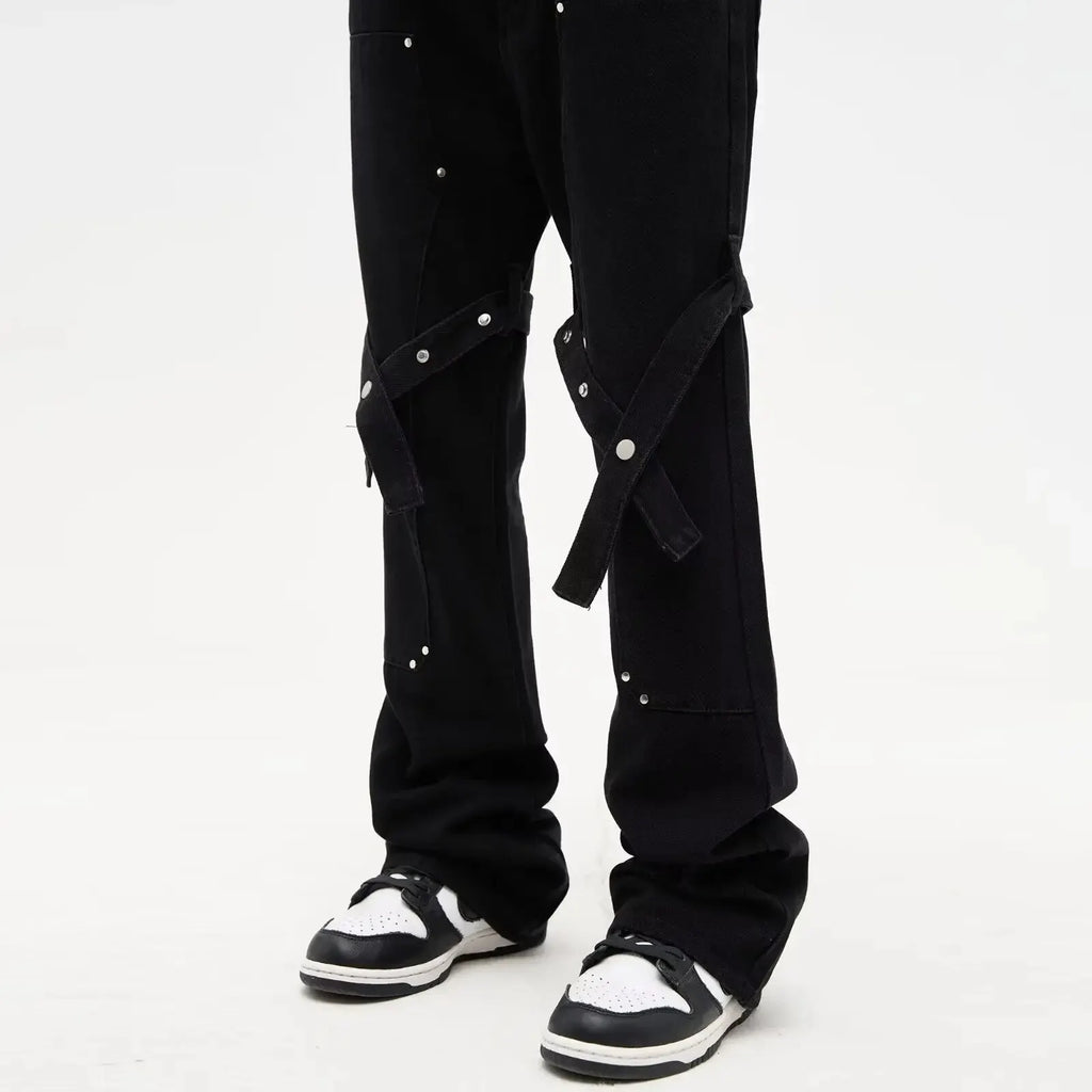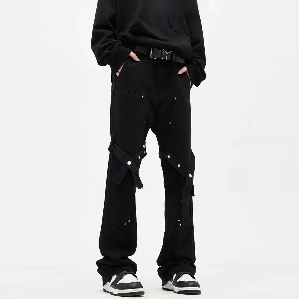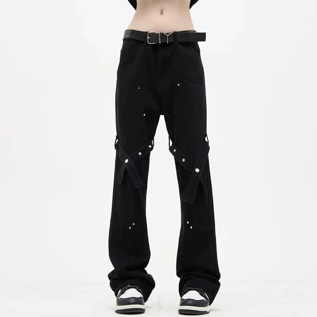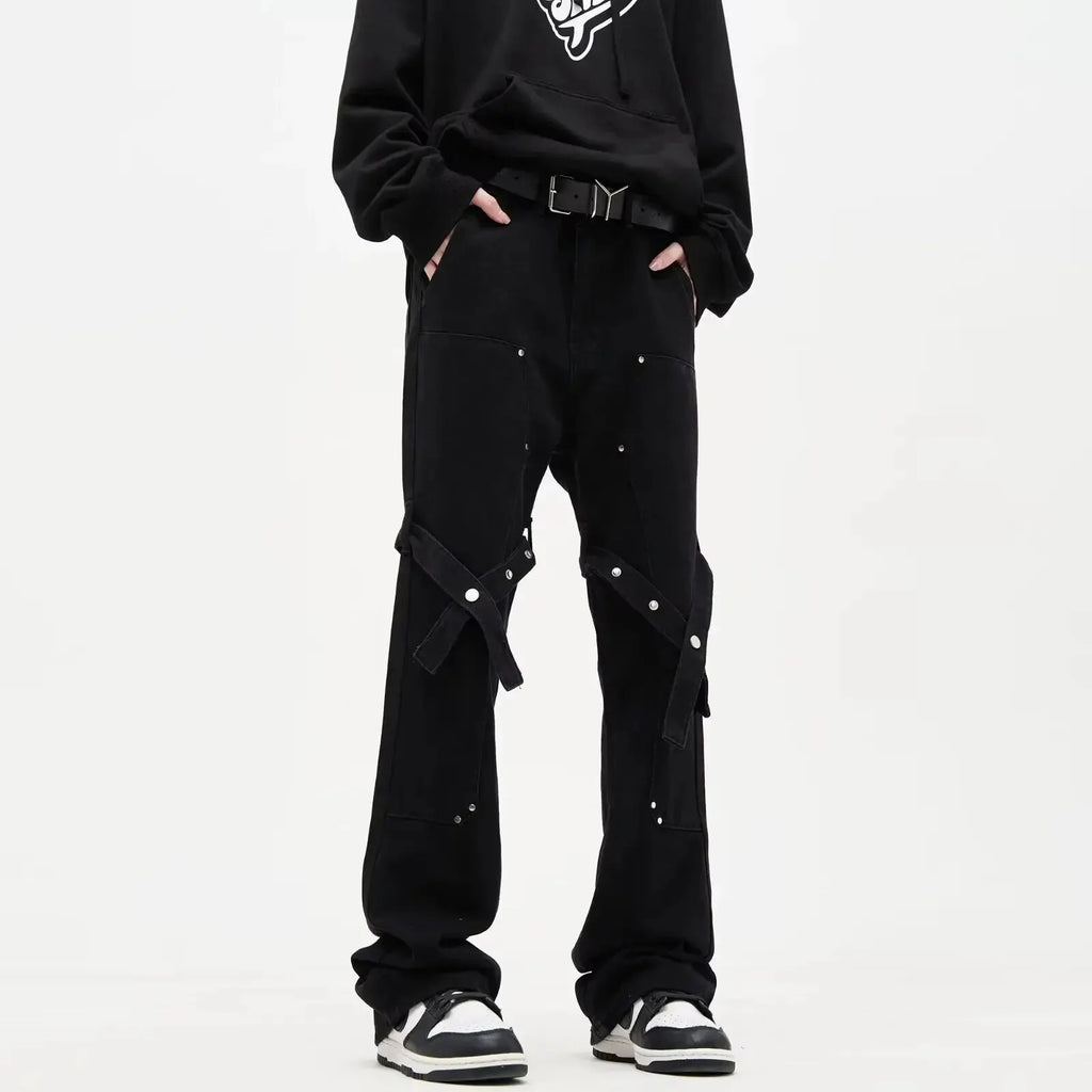 Upgrade your wardrobe today with our Pure Black Jeans Men's Autumn Trendy Tied Design Sensibility Bootcut Pants Couple Functional, where contemporary design meets ultimate functionality. Don't miss out on the chance to elevate your fashion game this season!