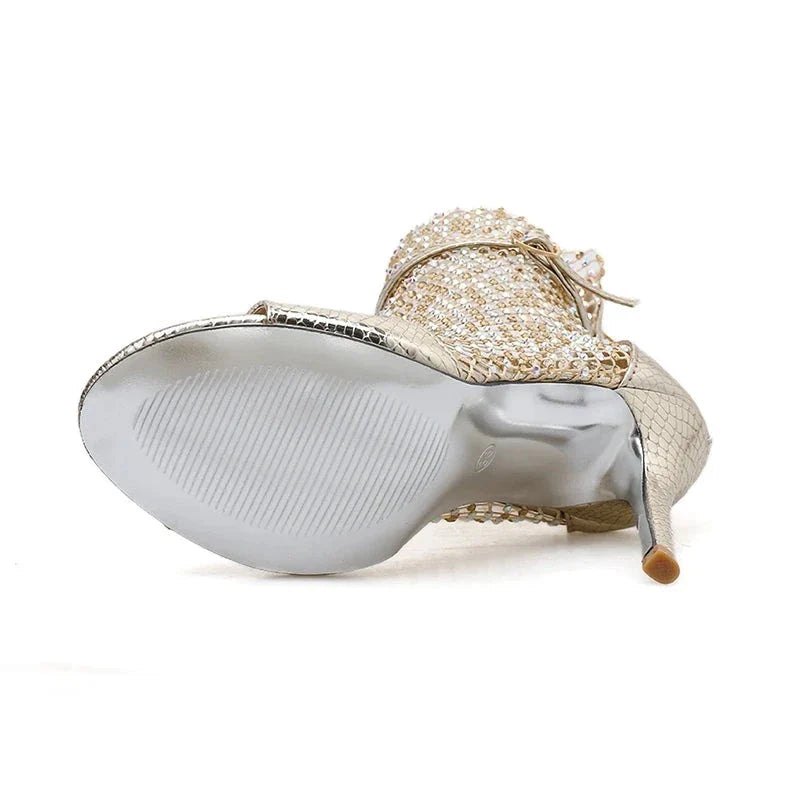 Step into the spotlight with our Gold Glitter Rhinestone Mesh Ankle Sandals Boots High Heels Sexy Booties Peep-toe Pumps Lady Party Shoes. Designed for those who love to make a bold fashion statement, these stunning ankle boots are perfect for any party or special occasion. Featuring a mesmerizing gold glitter finish and sparkling rhinestones, these high heels will elevate your style to a new level of glamour.