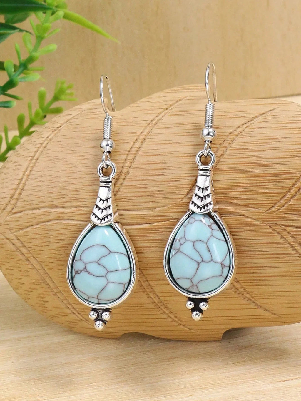 Complete your bohemian look with this stylish jewelry set featuring water droplet stone inlaid earrings and a short necklace. Embrace your free-spirited style with this classic and simple set, perfect for any holiday occasion. Add a touch of playfulness to your ensemble with this unique and quirky set.