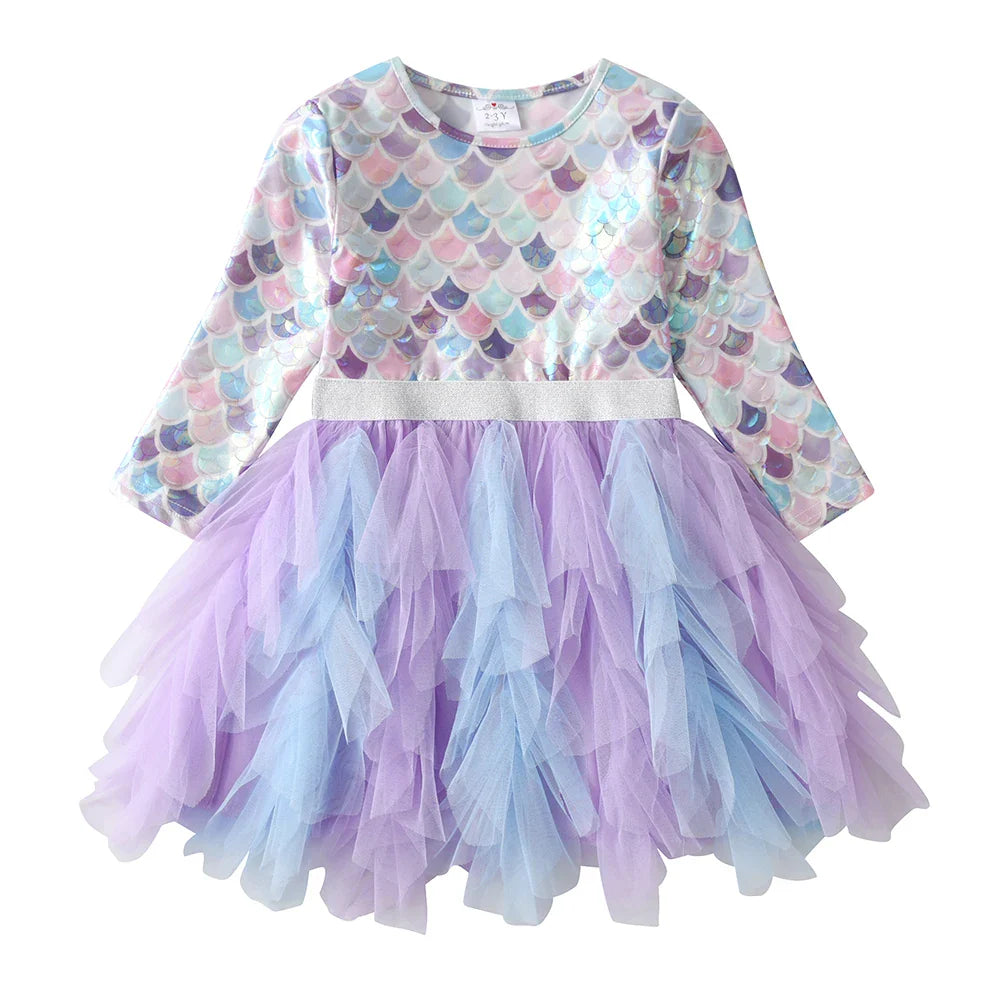 Let your child express her inner mermaid with this fabulous dress that combines style and comfort. Whether she's attending a party or simply dressing up for fun, the Princess Dress Mermaid Children Birthday Party Girls Dress Irregular Layered Prom Kids Long Sleeve Costumes is a must-have addition to her collection. Your little one will love the vibrant colors and fun cartoon print that adds a whimsical touch to her outfit. Elevate her dress-up game today!