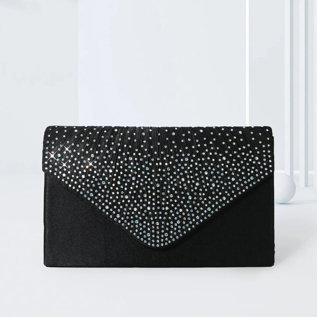 The Elegant Rhinestone Evening Bag Ruched Clutch Purse Luxury Flap Handbag boasts a captivating ruched design adorned with shimmering rhinestones that catch the light beautifully. The sophisticated flap closure adds an extra layer of elegance while ensuring your essentials are securely tucked away.