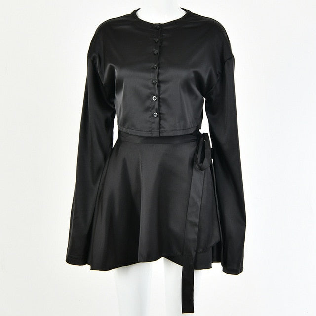 This Casual Satin Two Piece Dress Set For Women White O-neck Button Top Bandage Mini Pencil Skirts Outfits Fashion Party Suit is designed for women aged 18-35, making it an ideal choice for trendy young adults. Pair it with your favorite accessories and heels for a night out, or dress it down with flats for a more laid-back look. Regardless of the occasion, this outfit guarantees you'll stand out in style.