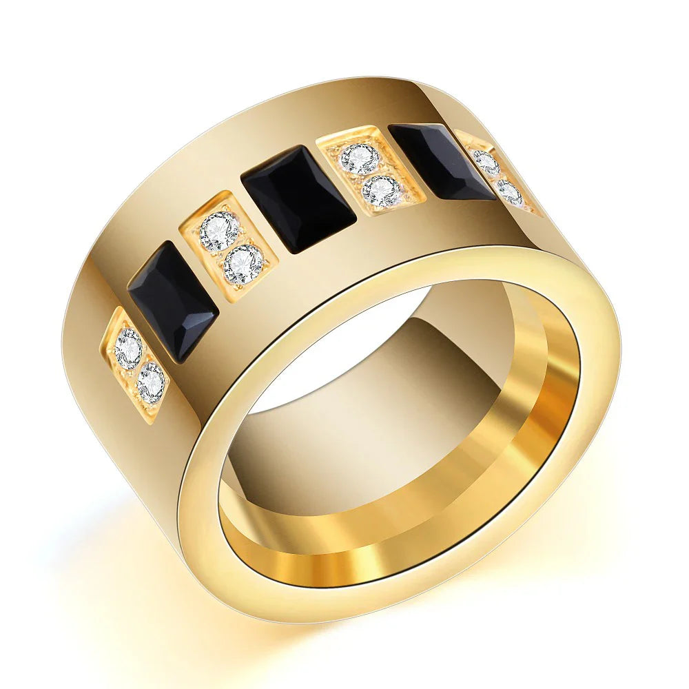 Crafted from high-quality stainless steel, this wedding band ensures longevity and resilience against wear and tear. The pave setting of the crystals adds a luxurious touch, reflecting light beautifully and creating a dazzling effect. With a surface width of 12mm, this ring offers a bold statement without compromising on comfort.