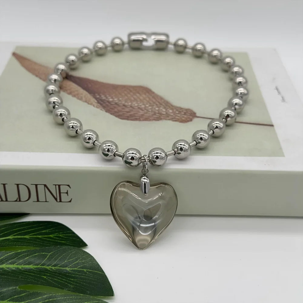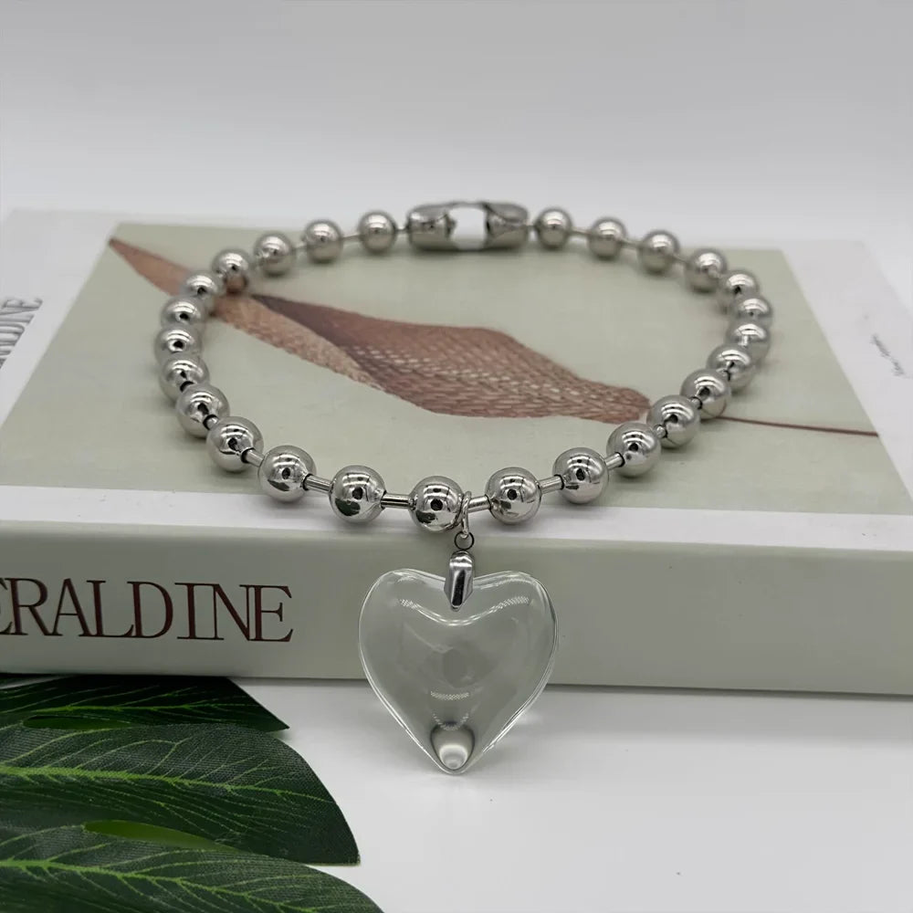This trendy Grunge Fashion necklace takes the Y2K Oversize Ball Beads Chain Statement Choker Necklace to a whole new level of cool. The Glass Heart Pendant adds a touch of emotion, perfect for making a statement at the club or showing off your punk style.