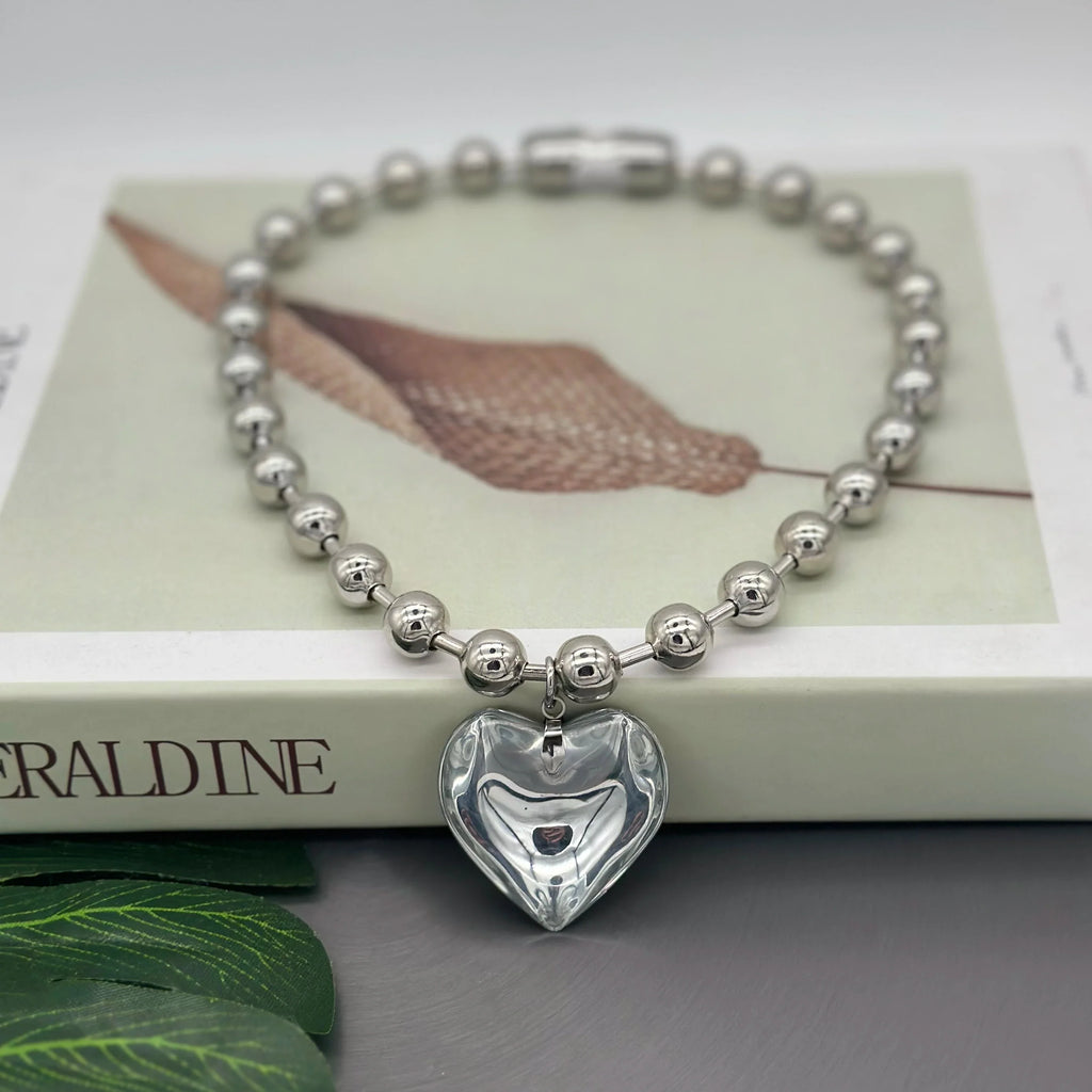 Featuring a stunning glass heart pendant, this necklace is perfect for adding a touch of emotion and individuality to your outfit. The oversized ball beads chain offers a bold statement, making it ideal for club nights, parties, or simply enhancing your punk-inspired looks.