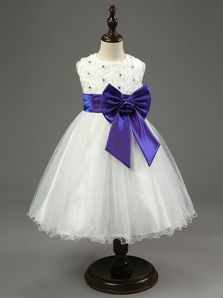 This is an all-white long lace dress for little girls with a big pink bow as decoration. It is such a charming birthday dress.