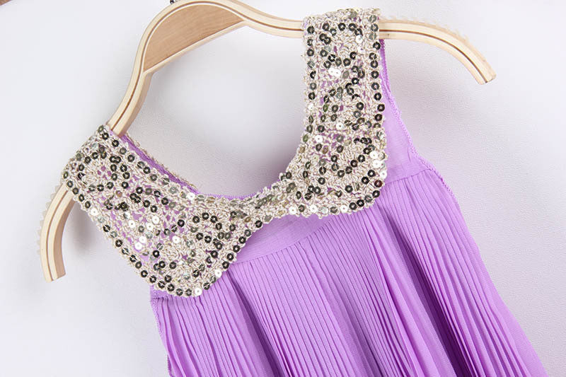 This Summer Girls Pleated Chiffon One-Piece Dress With Paillette Collar Children Colthes For Kids Baby, Pink/Green is versatile enough for casual outings or more formal events. Its sleeveless design pairs beautifully with a light cardigan for cooler days, while the solid pattern allows for easy accessorizing.