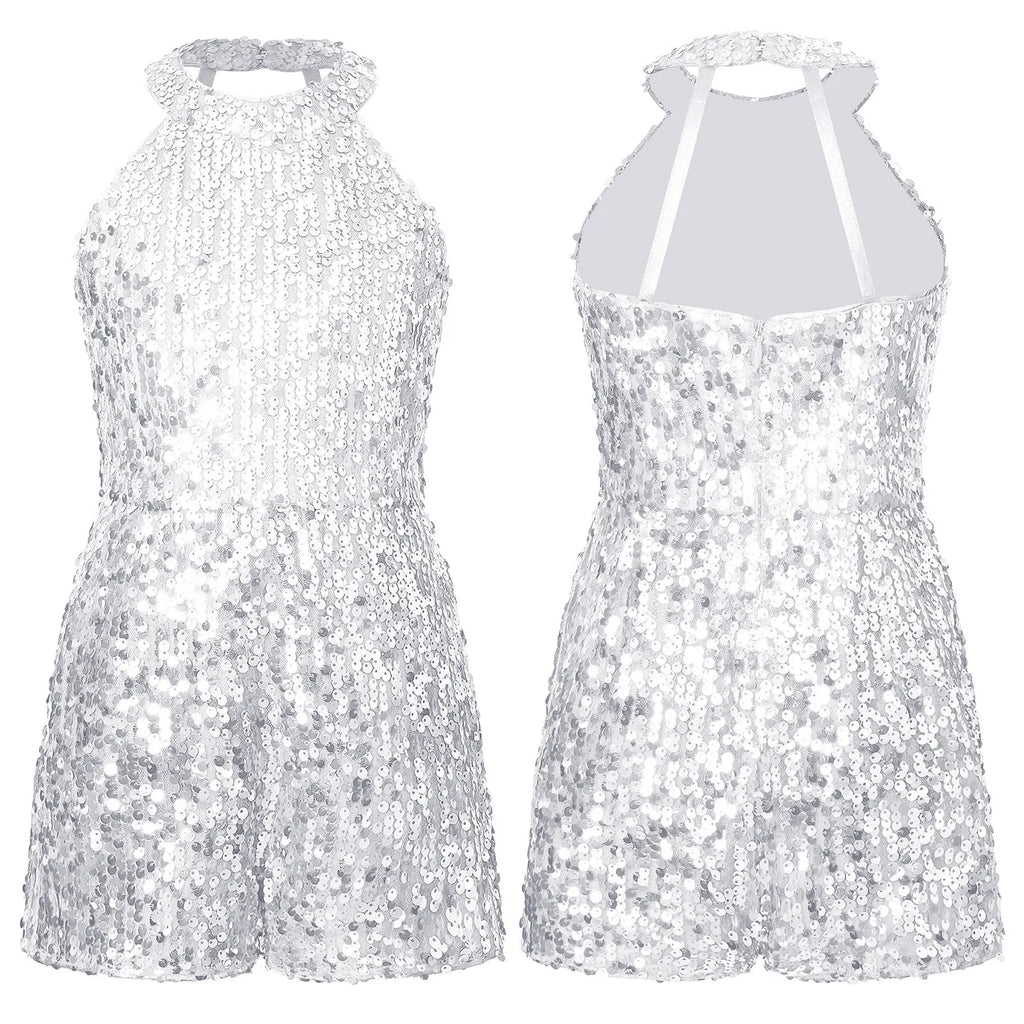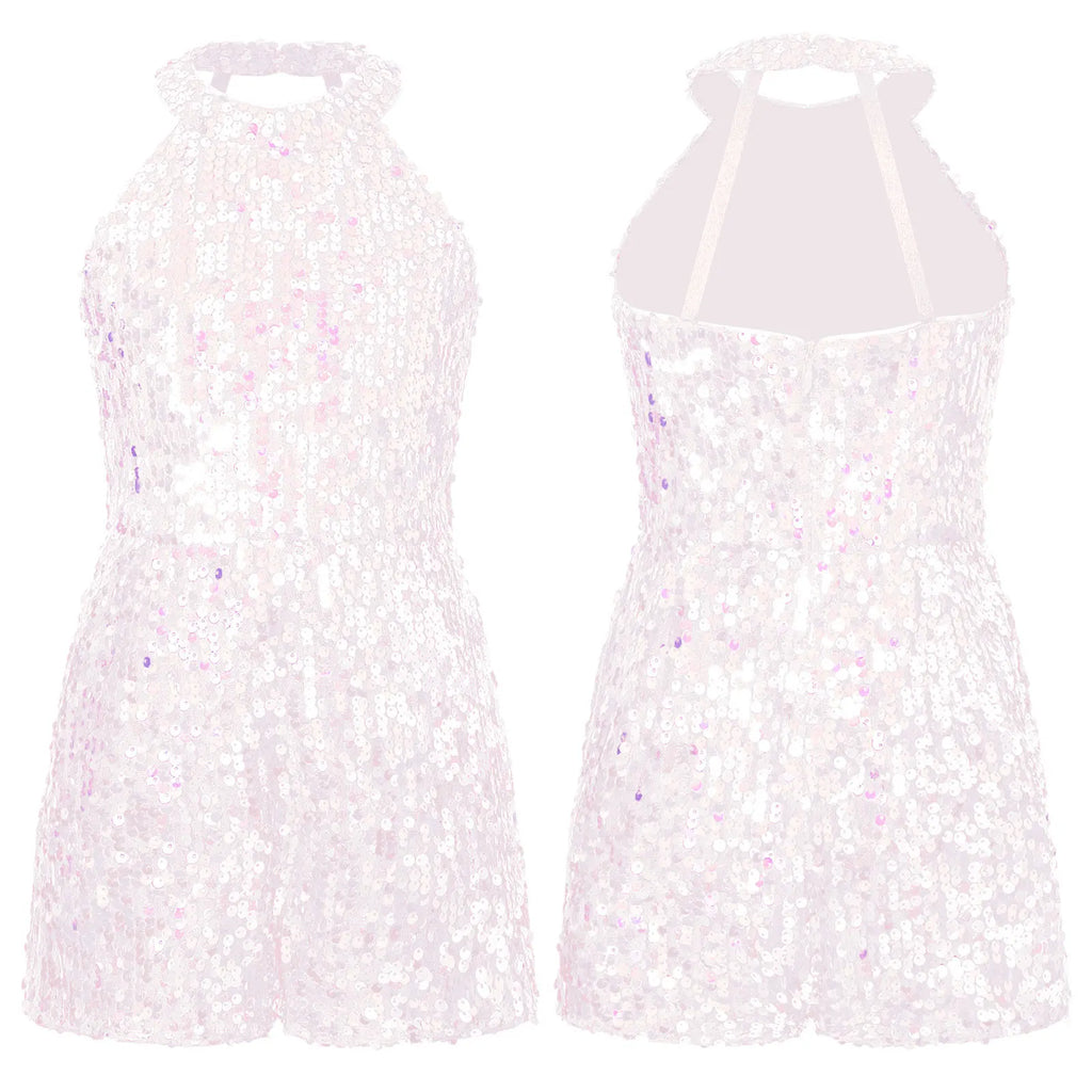 Get your little one ready to sparkle and shine with this Kids Girls Shiny Sequin Bodysuit! Perfect for parties, weddings, and performances, this halter bodysuit is covered in eye-catching sequins and is sure to make a statement. Designed for kids, it's comfortable and stylish, making it a must-have for any occasion.