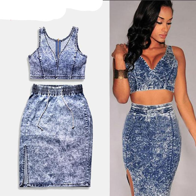 Step out in confidence this season wearing the Sexy Denim Crops Tops And Skirt 2 Piece Set Deep V Neck High Waist Elastic Snowflakes Package Hip Corset Hollow-Out Set. Contact us for more detailed sizing information and make this stunning set a staple in your summer collection!
