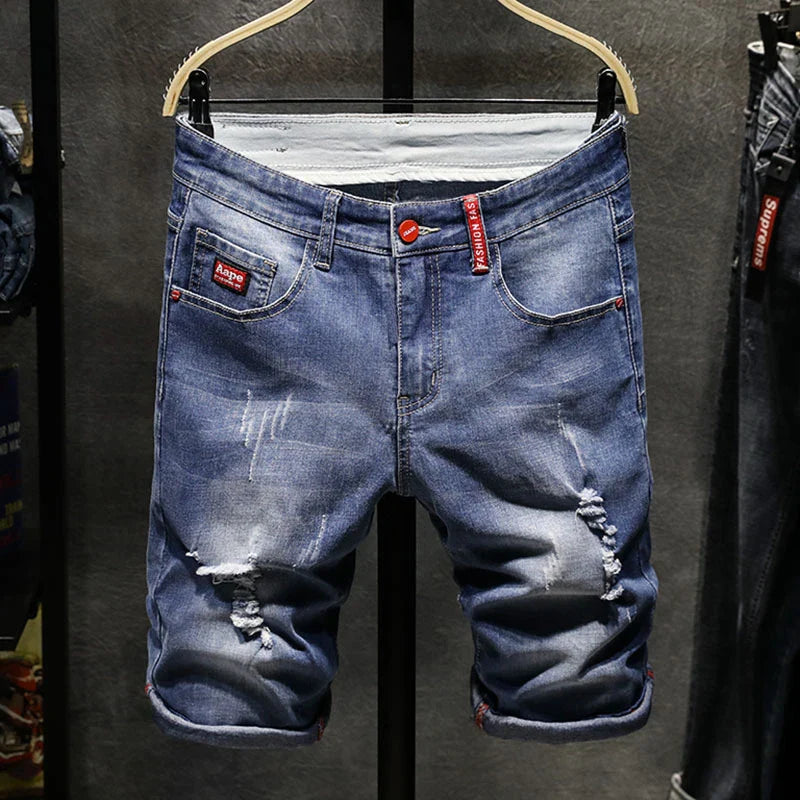 Featuring a slim fit and a distinctive ripped design, these shorts add a rebellious flair to any casual outfit. The knee-length cut perfectly balances style and comfort, making them ideal for both laid-back days and social outings.