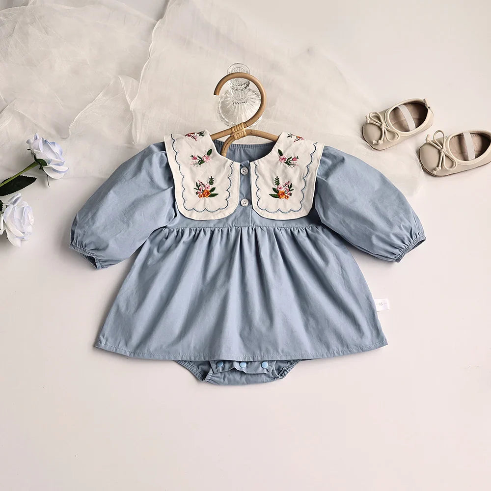 Treat your little one to the ultimate in style and comfort with our Solid Pleated Baby Bodysuit Toddler Girls Princess Clothes embroidery Big Collar Infant Clothing. This enchanting bodysuit is expertly crafted from soft, high-quality cotton, ensuring your child enjoys all-day comfort while looking effortlessly adorable. The charming big collar and intricate embroidery details make this bodysuit a standout piece in any toddler's wardrobe.