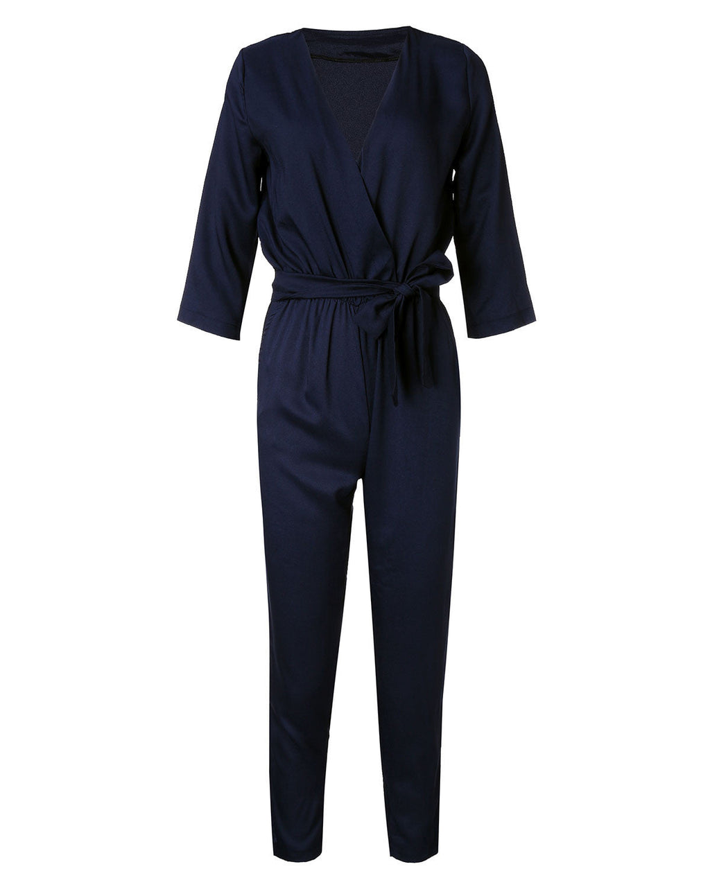 Stylish and comfortable, solid pattern, ankle length pants, regular fit, v-neck, half sleeved with sashes decoration, cotton and polyester jumpsuits.