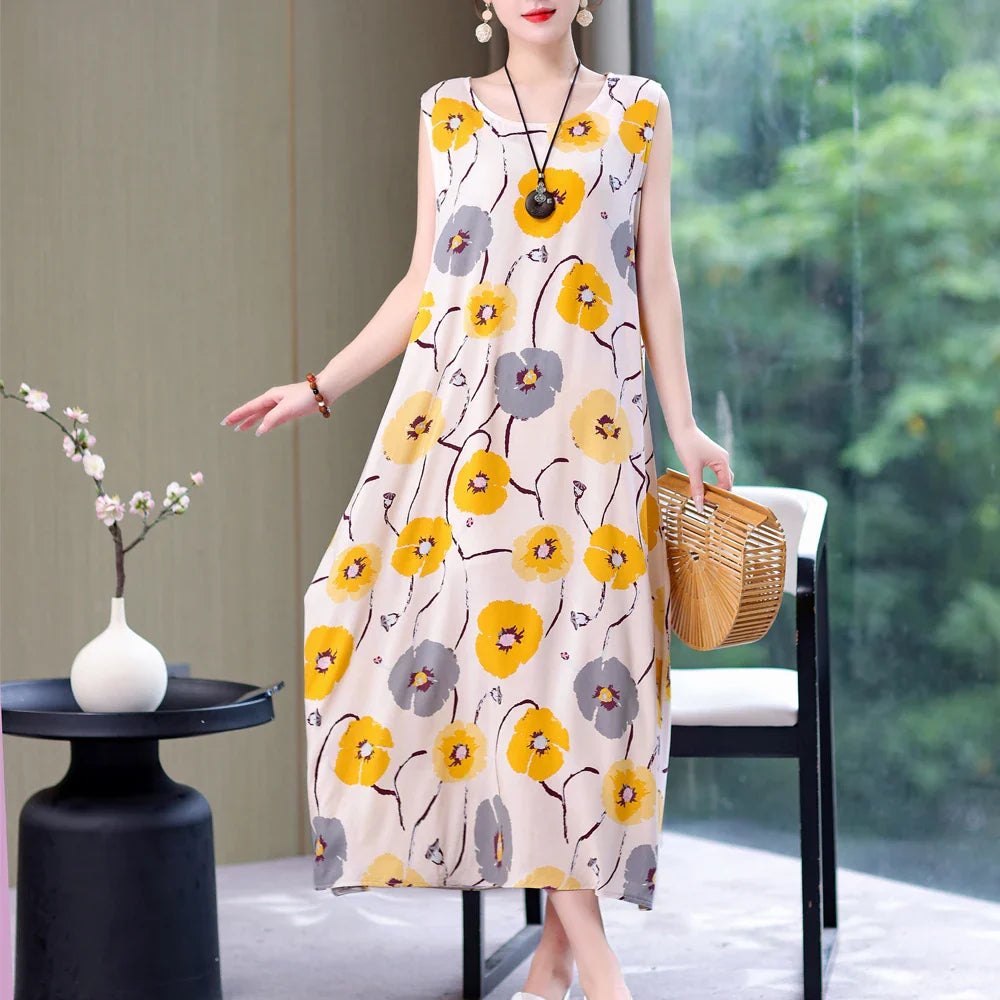 Elevate your summer wardrobe with the Vintage Summer Dress Vestido Print Natural Regular Sleeveless O-neck Cotton Dresses Women Clothing Plus Size and embrace the warm weather in style!