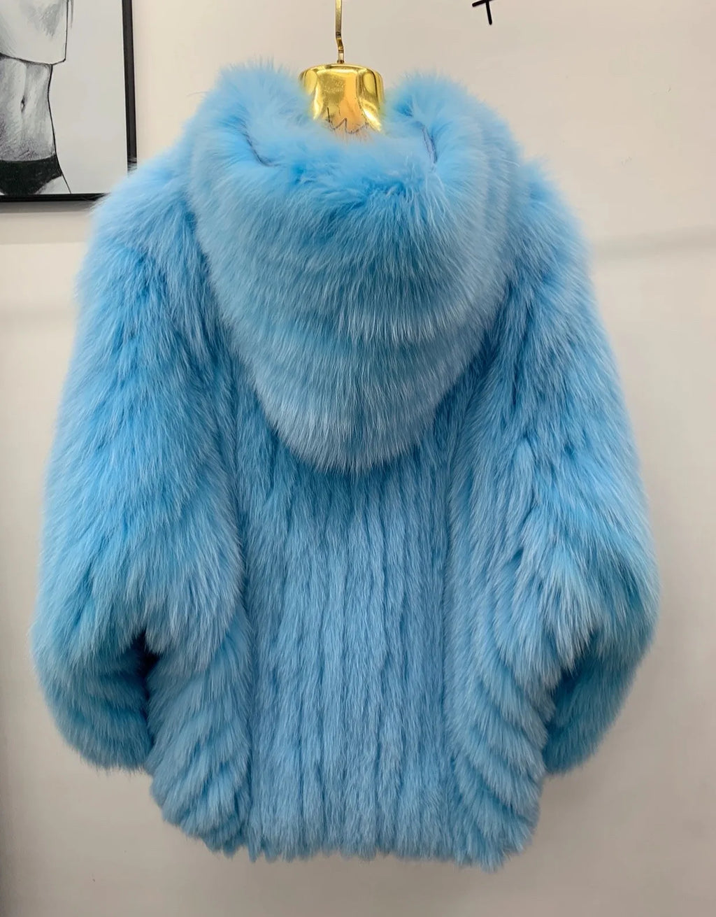 This cozy, faux fur jacket is the perfect addition to your winter wardrobe. With a hood and loose fit, it will keep you warm and stylish all season long. The plush material will make you feel like you're wrapped in a cloud. Stay cozy and chic with this must-have jacket!