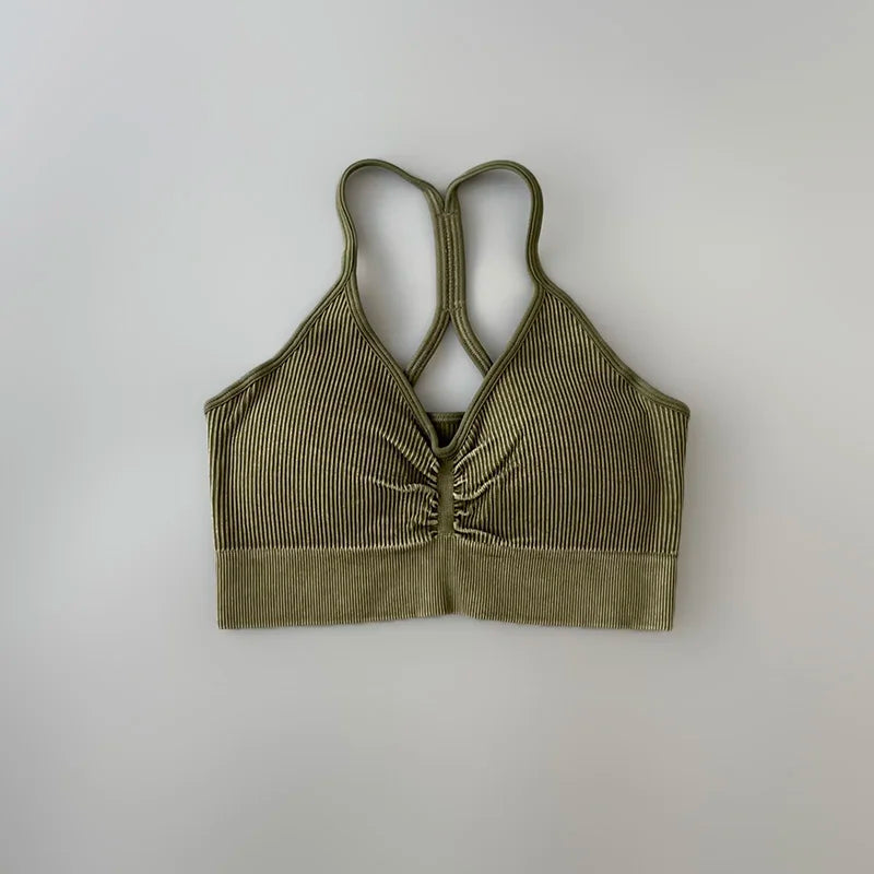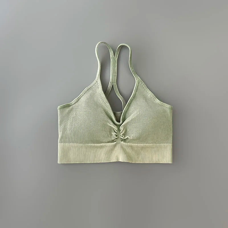 Whether you’re diving into a challenging yoga pose, lifting weights, or going for a run, the Seamless Ribbed Sports Bra Women Yoga Crop Top Padded Push Up Workout Tank Top is your go-to companion. The elastic band ensures a snug fit, while the available colors—Beige, Grass Green, Olive, Black, and Army Green—allow you to express your personal style.
