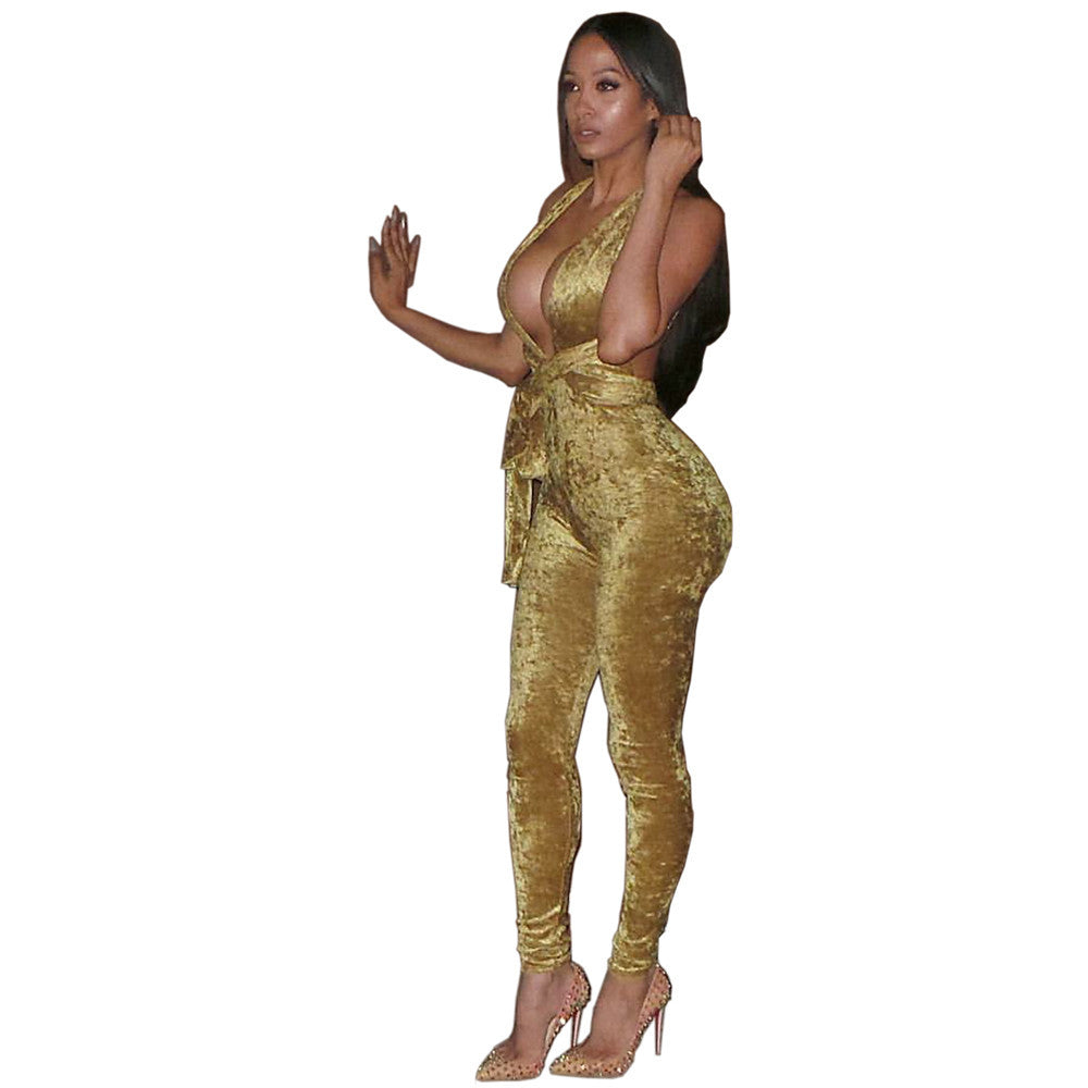 Step into the spotlight with the Deep V Neck Club Velvet Shinny Backless Jumpsuit Sleeveless Yellow Full Length Bodysuit. This stunning piece is designed for those who want to make a statement at any event. Crafted from luxurious velvet, this jumpsuit not only looks fabulous but feels incredible against the skin, offering you both style and comfort.