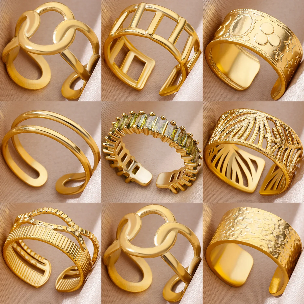 Discover the stunning Rings for Women Gold Color Couple Jewelry Aesthetic Adjustable Punk Embossed Hollow Wide Ring, designed for those who dare to stand out. These eye-catching rings are the perfect accessory to elevate any outfit, combining a unique punk-inspired aesthetic with modern functionality. Crafted from high-quality stainless steel, these rings not only exude elegance but promise durability that lasts.