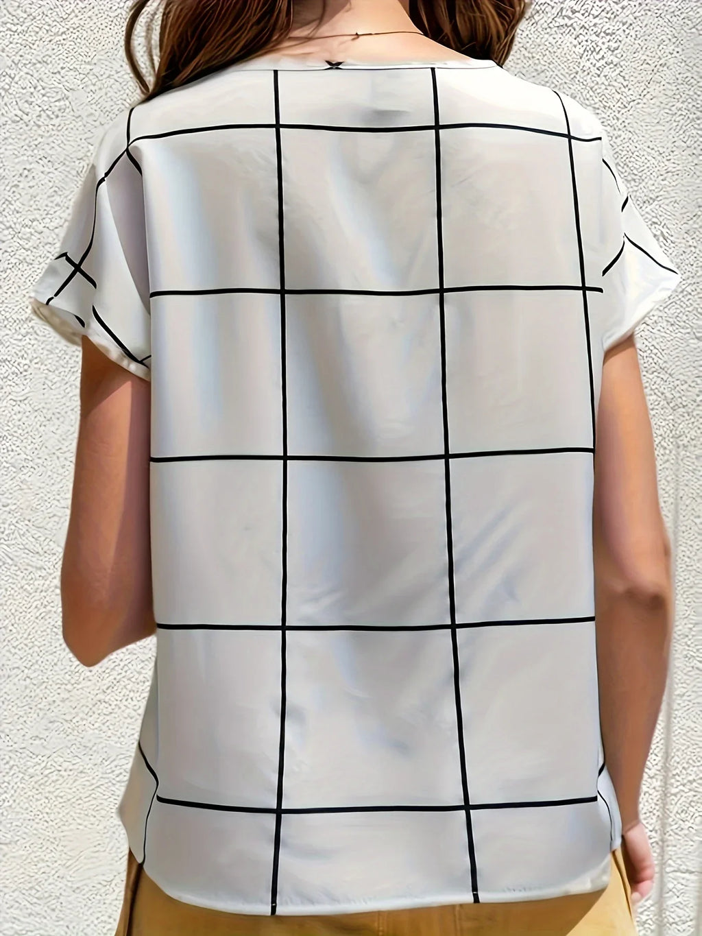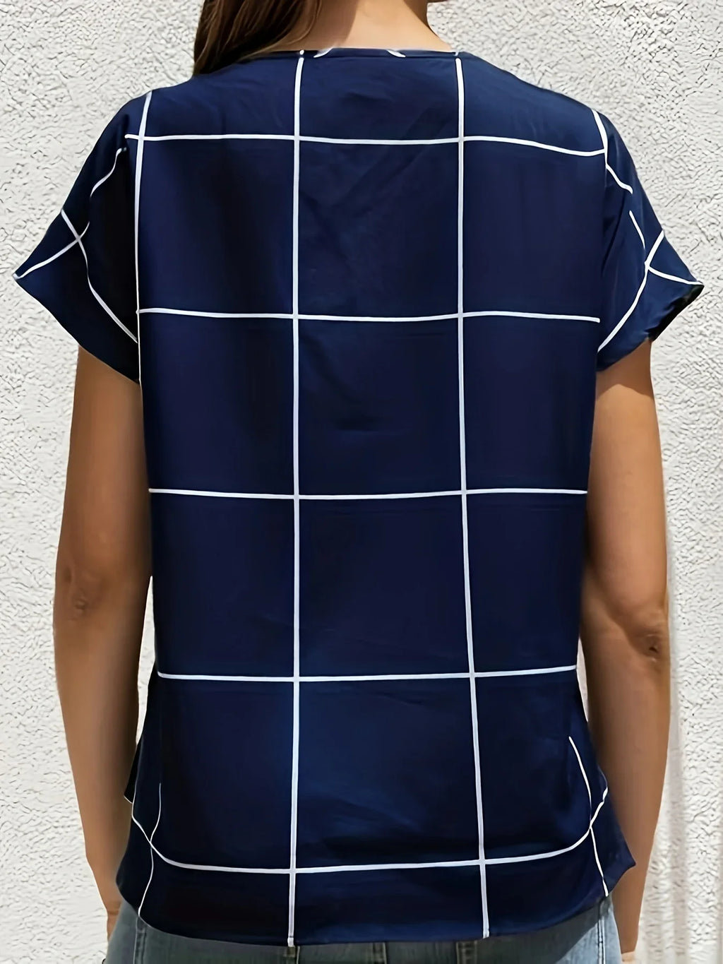 Get ready to rock your casual wardrobe with this versatile plaid printed blouse! Featuring a stylish v-neck and short sleeves, this top will elevate any outfit with a touch of chic flair. Stay stylishly comfortable all day long with this basic must-have for all ladies.